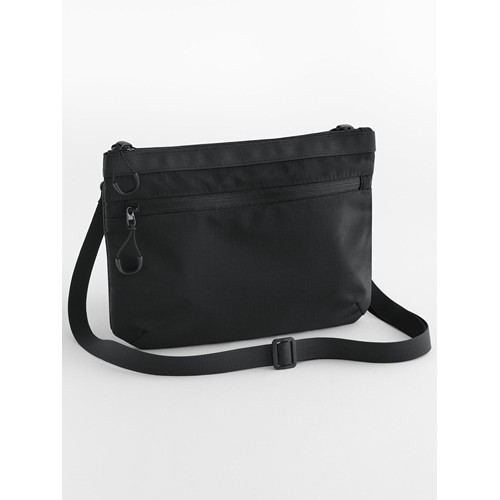 100% poliestere riciclato. Borsa a tracolla, tessuto idrorepellente, stile minimalista, apertura con due zip bidirezionali, tasca posteriore con zip, tasca interna in rete, cerniere in gomma, tracolla regolabile e removibile. Dimensioni: 20x15x6cm, Capacità: 1 litro. Tracolla: 124cm, Area stampabile: 17x5cm massimo. Etichetta strappabile. Care instructions : Non lavare in acqua - Non candeggiare - Non usare asciugatrice - Non stirare